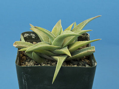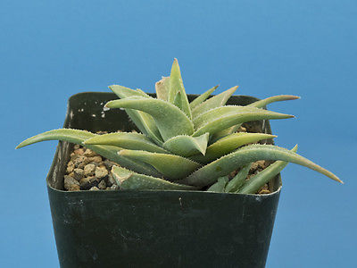 This plant is an open pollinated hybrid with Aloe pseudoparvula as the seed parent. This plants leaves are a pale green/blue color with very light crème/white raised textured spots and small short white teeth along the leaf edges. This plant will freely offset to form a cluster. Grow this plant in sun to part shade. The flower is red//pink/orange.