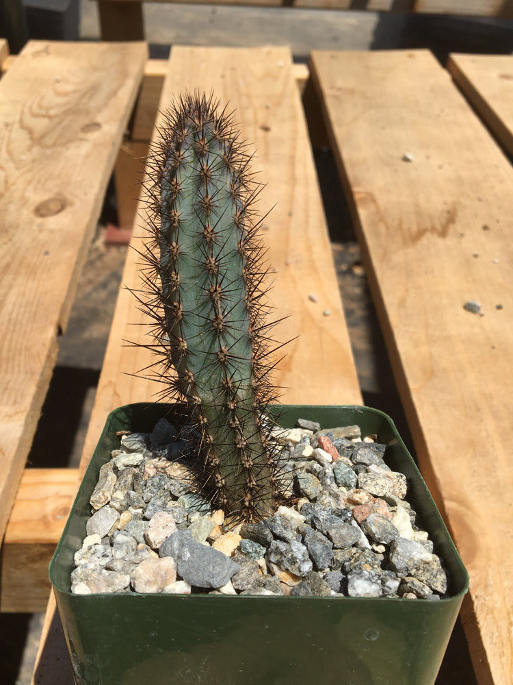 This plant is native to northern Argentina. Shrubby columnar with blue stems and black spines. Water this plant sparingly in the spring/summer and keep dry over the winter time. The flowers are large, white with purplish outer petals.