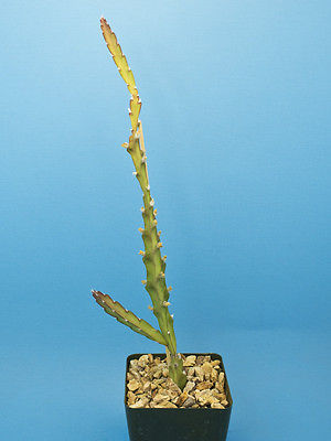 This plant is native to Argentina, Brazil and Paraguay. These are rooted cuttings. Grow the plant in part shade to full shade. In bright sun, the plant becomes very red to purple. In shade it greens up. This is an epiphytic jungle cactus that trails and climbs other nearby shrubs and trees, very suitable for a hanging basket. Quite tolerant of abuse, providing the soil is very well draining. The plant needs regular watering and can withstand a humid climate. The flowers are small and pale pink in color.