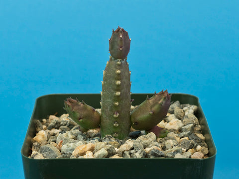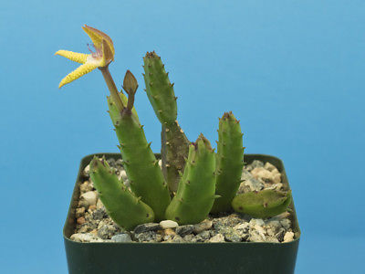 This plants habitat is Namibia, Botswana and the Northern Cape of South Africa. The plant grows best in full to partial sun. In full sun the stems take on a purplish tone. Water in the summer but let it dry out during the winter (when dormant, this plant is prone to rot). The flower is a lime/neon greenish yellow and pink in a star shape. The stems are somewhat fragile and may break off during shipping. We pack them as best we can for safe travel.
